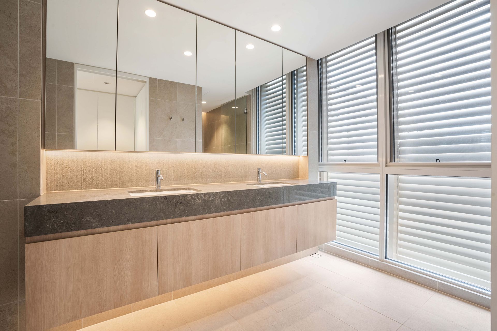 – Main bathroom with oversized showers and luxurious stone vanities, additional guest toilet